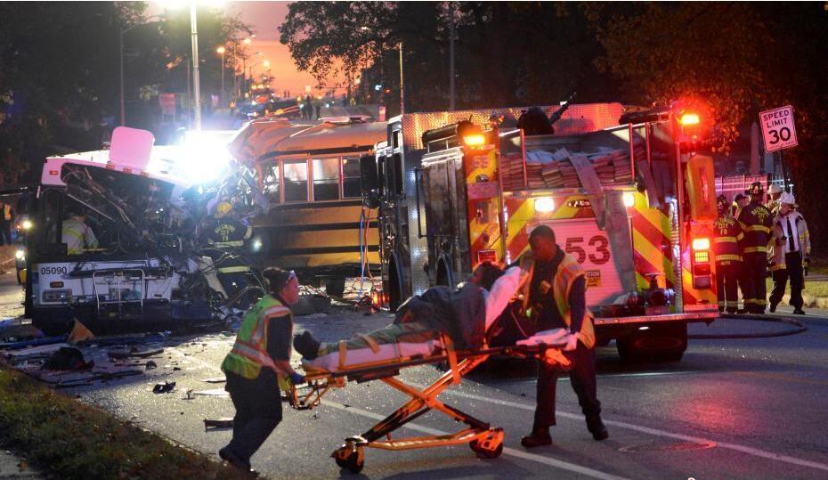 當地時間2016年11月1日,美國巴爾的摩,一輛校車和一輛公交相撞,造成6人死亡。