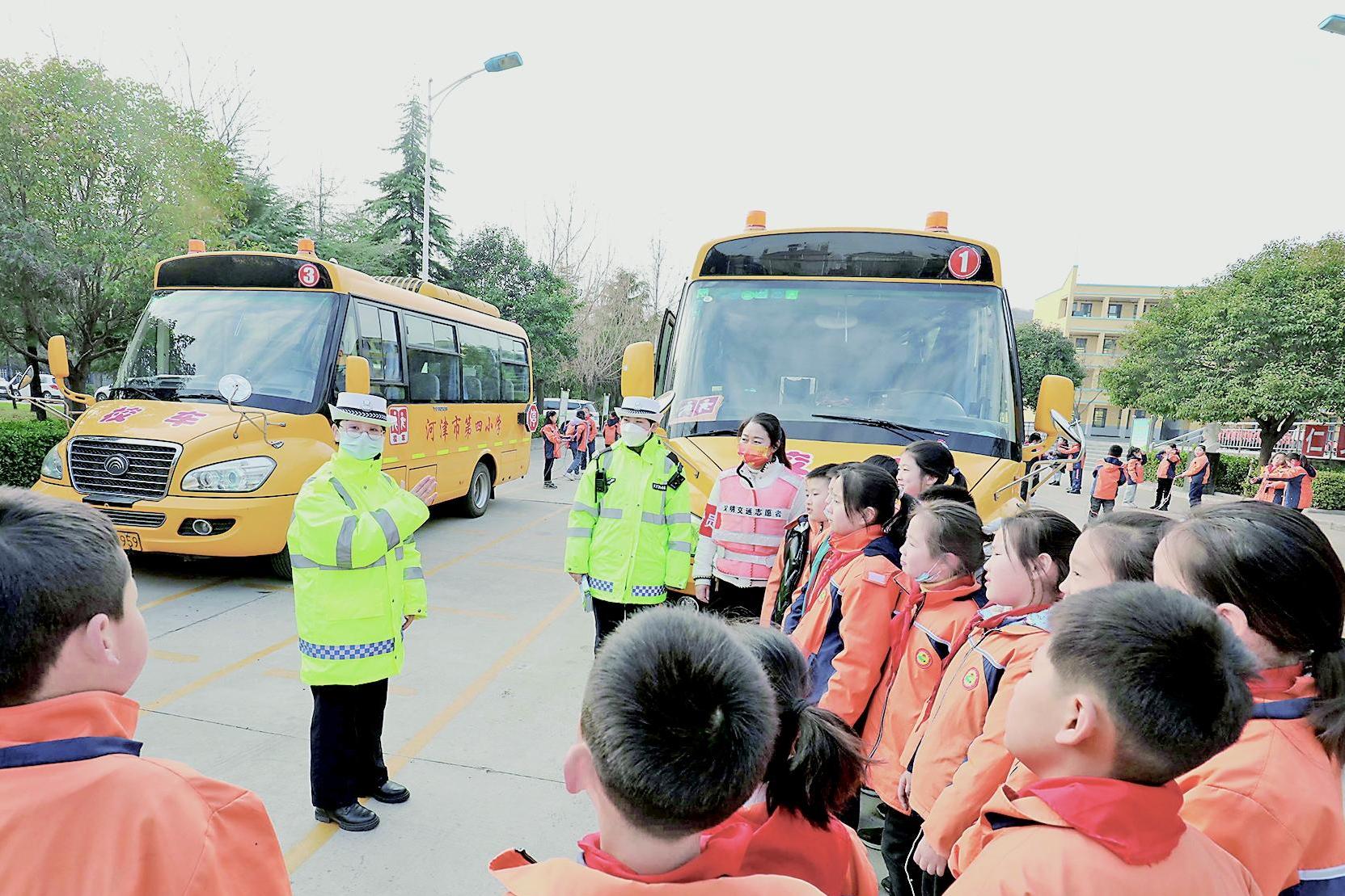 ▲12月13日,河津市公安局交警大隊民警為該市第四小學的學生,講解正確乘坐校車等安全常識。 為進一步強化轄區校車交通安全管理工作,切實確保冬季校車行車安全,當日......